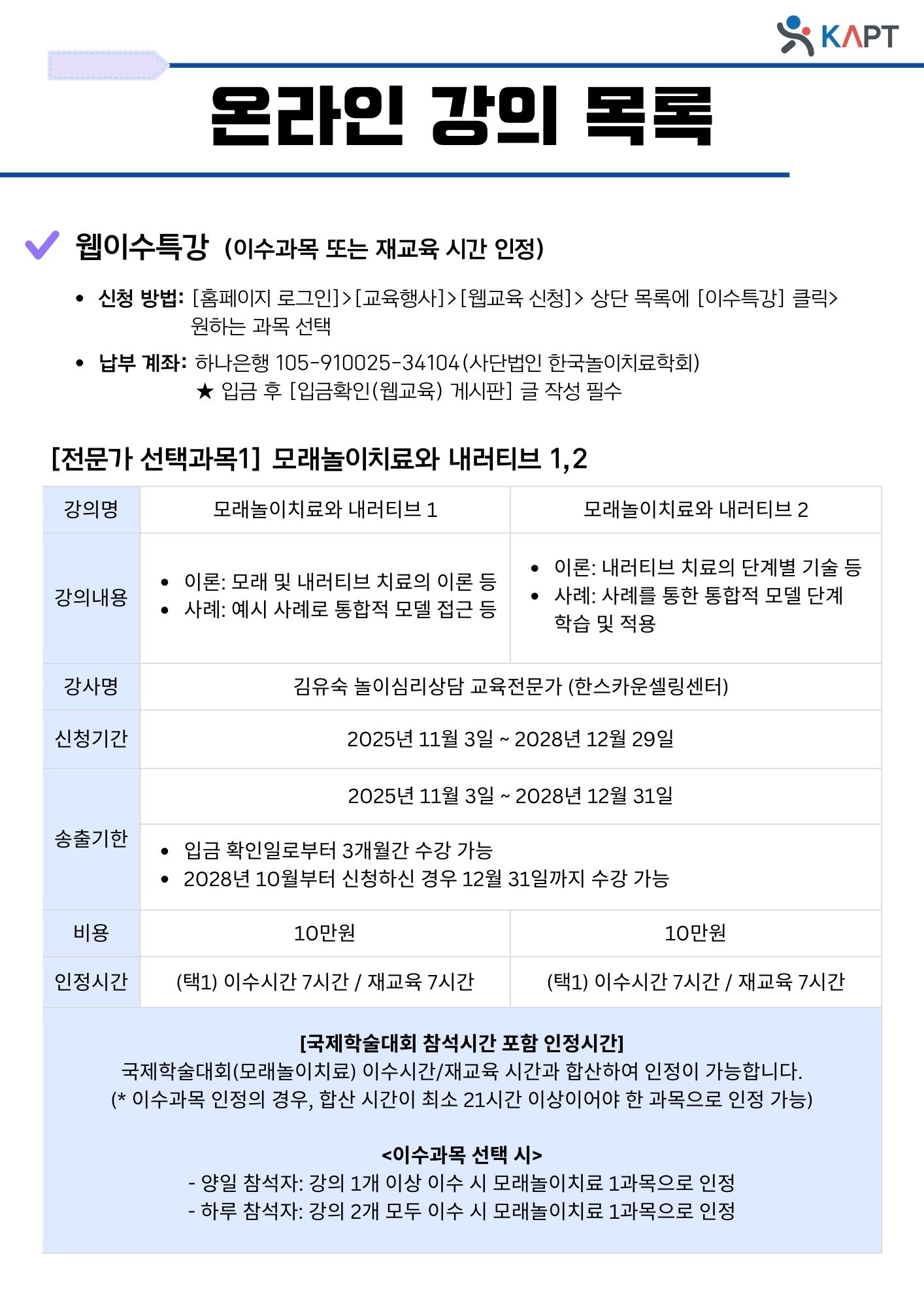 - 신청 방법: [홈페이지 로그인] > [교육행사] > [웹교육 신청] > 상단 목록 [이수특강] 클릭 > 원하는 과목 선택