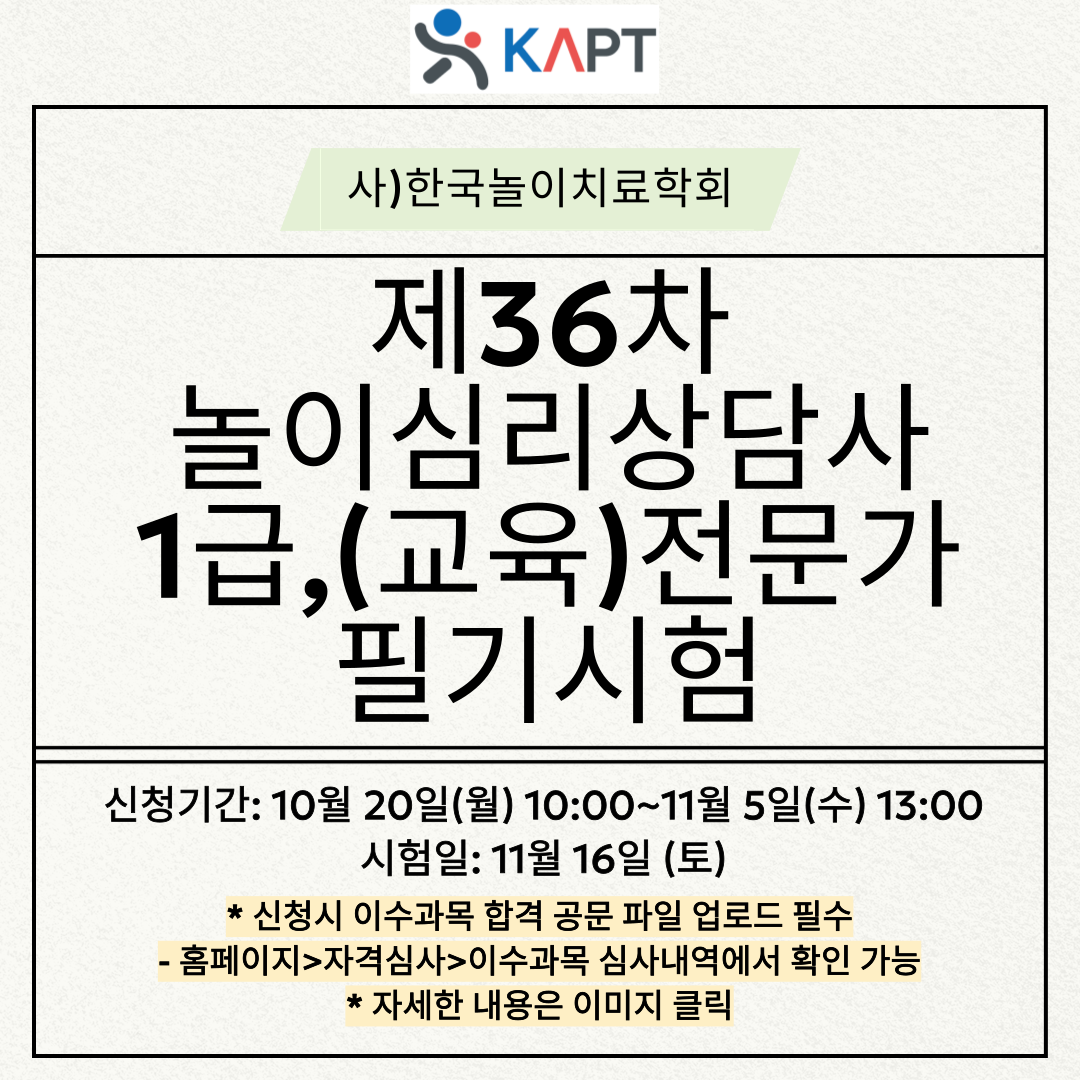 제36차 놀이심리상담사 1급 및 (교육)전문가 필기시험 안내안녕하세요 선생님,사단법인 한국놀이치료학회 자격관리위원회입니다.제36차 놀이심리상담사 1급 및 (교육)전문가 필기시험에 대해 아래와 같이 안내드립니다.1) 신청기간: 10월 20일(월) 10:00 ~ 11월 5일(수) 13:002) 시험 일정: 11월 16일(일) (자세한 내용은 아래의 표 확인)응시영역필기시험 시간필기시험 과목필기시험장소필기시험결과 발표1급1교시9:30-10:20놀이심리상담 이론Ⅰ서울특별시 중구 통일로 26 한일빌딩,공간모아 서울역 9홀(9층)11월 19일(수) 13:00 예정2교시10:30-11:20상담이론전문가1교시9:30-10:20놀이심리상담 방법 및 기술서울특별시 중구 통일로 26 한일빌딩,공간모아서울역9홀 서브(9층)2교시
