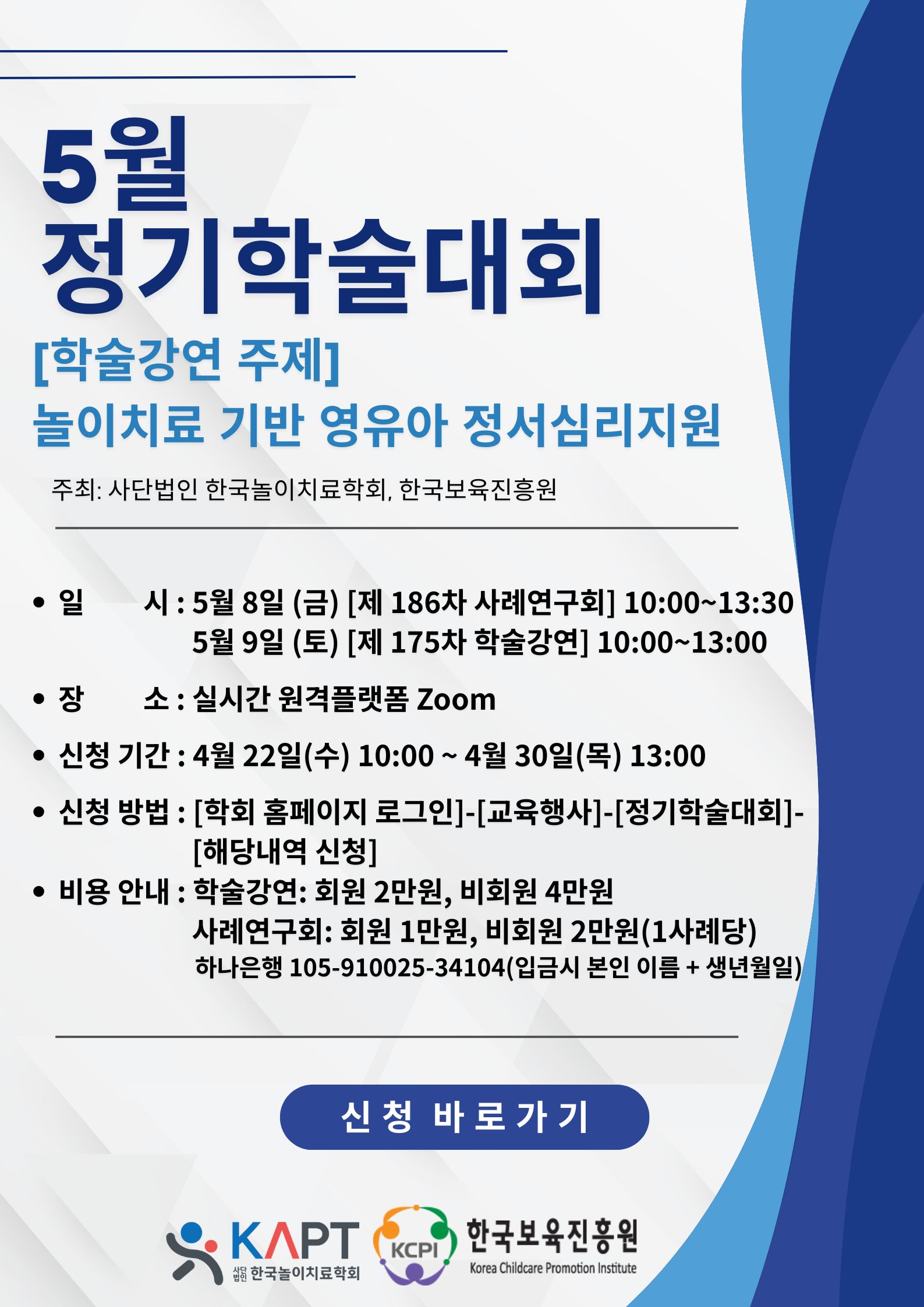 안녕하십니까사단법인 한국놀이치료학회는 학회원들의 전문성 향상을 위해 3월 정기학술대회(제174차 학술발표 및 185차 사례연구회)를 아래와 같이 실시합니다.특히 제174차 학술발표는 2025년 본 학회에서 연구지원을 받아 수행된 연구 중「전생애 발달 관점의 놀이치료: 성인·노인 적용의 연구와 실제」를 주제로, 놀이치료의 적용 대상을 성인과 노인으로 확장한 논문을발표하는 자리로 진행됩니다.회원 여러분의 많은 관심과 참여 바랍니다.감사합니다.