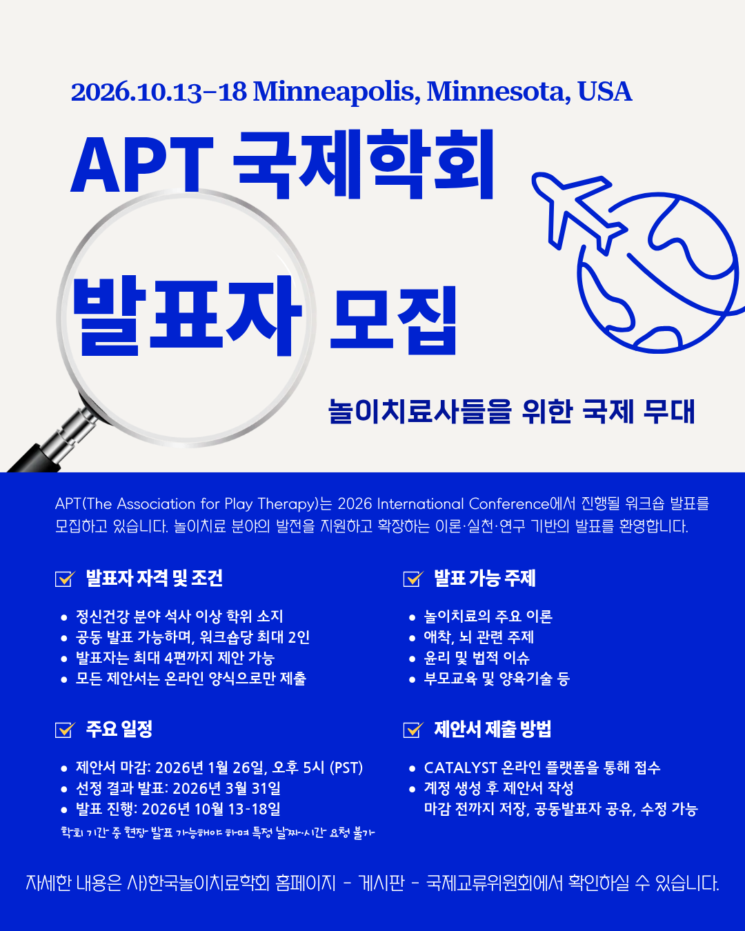 <2026년 한국놀이치료학회 차세대 연구 지원 사업 안내> 2026년 한국놀이치료학회 편집위원회에서는 우수한 차세대 신진 연구자들의 연구 지원 및 연구의 활성화를 위하여다음과 같이 차세대 연구 지원 사업을 시행하고자 합니다. 이에 많은 관심과 참여 부탁드립니다.◈ 문의(편집위원회)홈페이지 내 ‘회원목소리’ 또는 메일 문의E-mail : research@playtherapykorea.or.kr